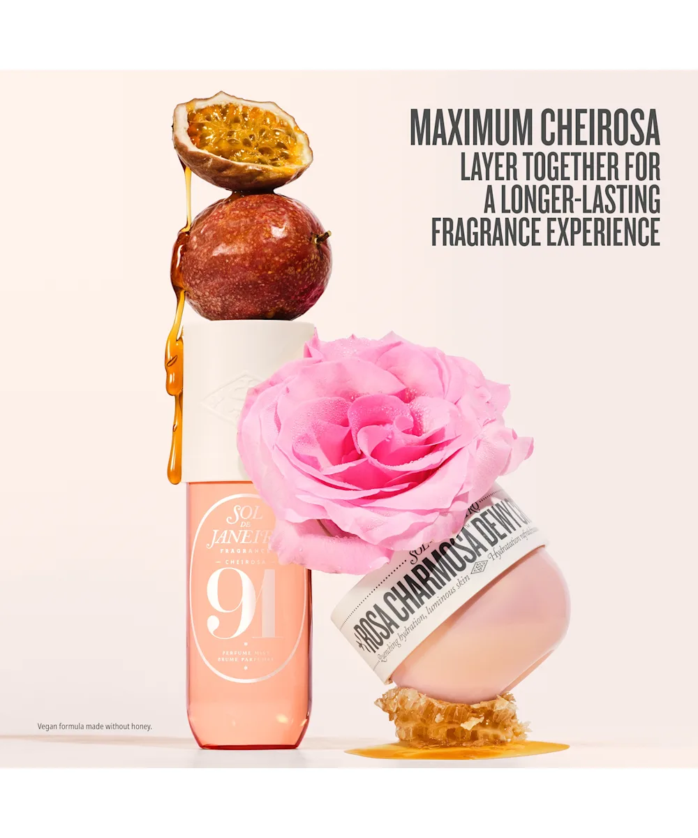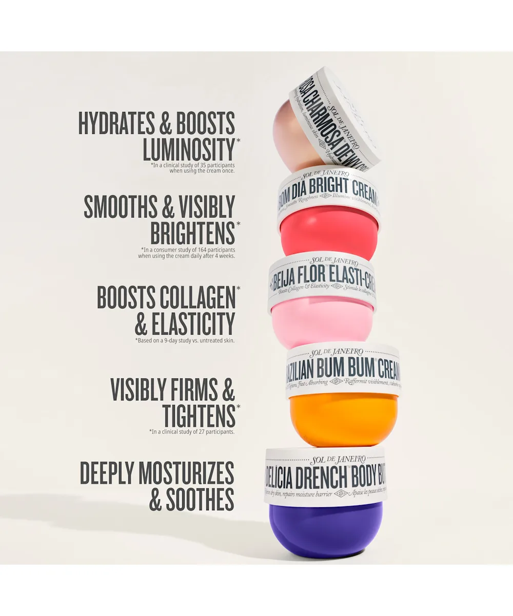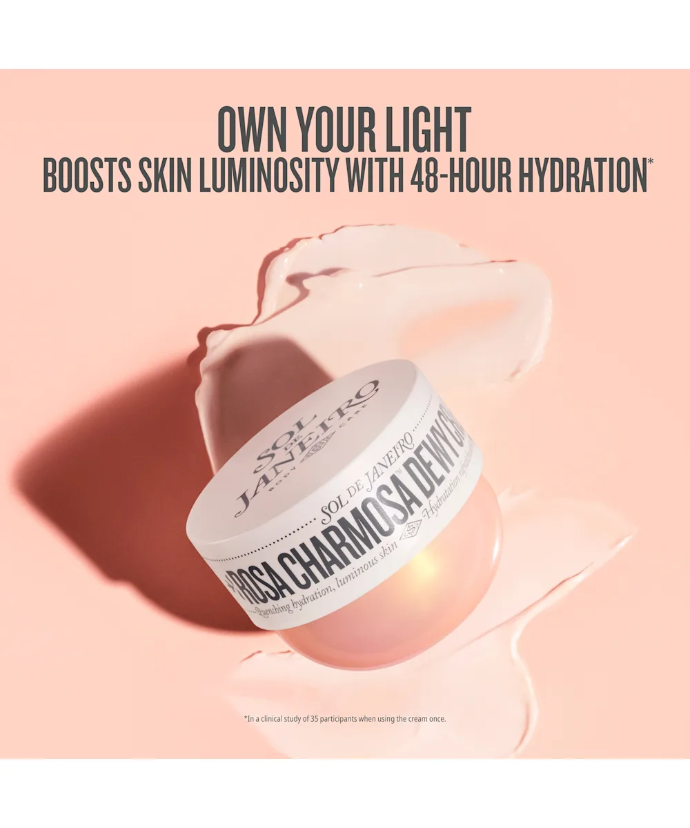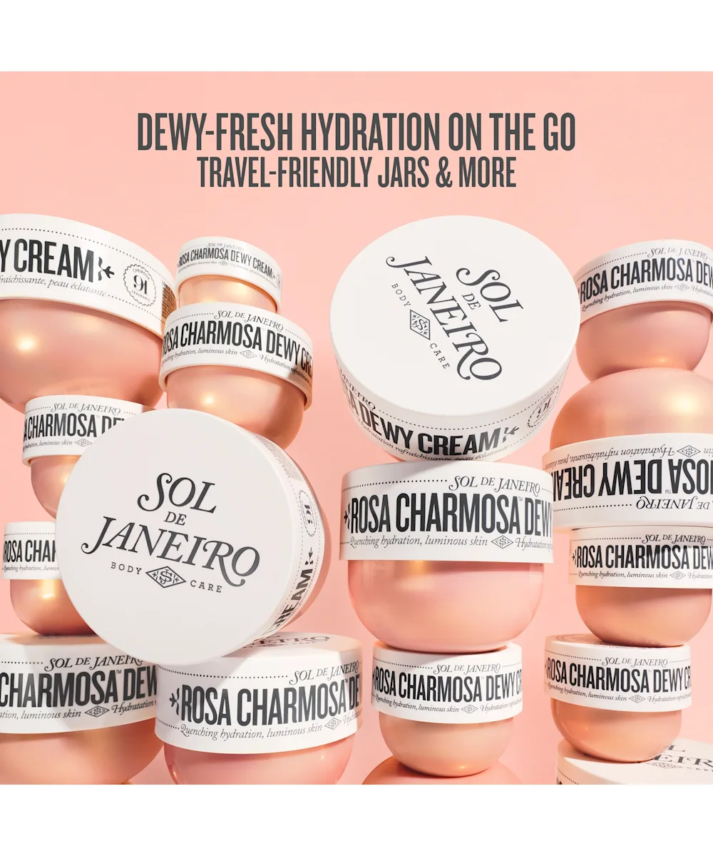 Hydrating and uplifting, the Sol de Janeiro Rosa Charmosa Dewy Body Cream delivers an instant rush of moisture and keeps skin quenched for up to 72 hours. Powered by native-Brazilian yacón essence, calming rosewater, and a light-reflecting crystal peptide, this fast-absorbing formula leaves your skin smooth, radiant, and refreshed. Its upbeat Cheirosa 91 fragrance blooms with Rio pink rose, juicy passionfruit, and honey caramel, an irresistible blend that feels bright, modern, and effortlessly charming. Glowy, nourished, lit-from-within skin for the win.