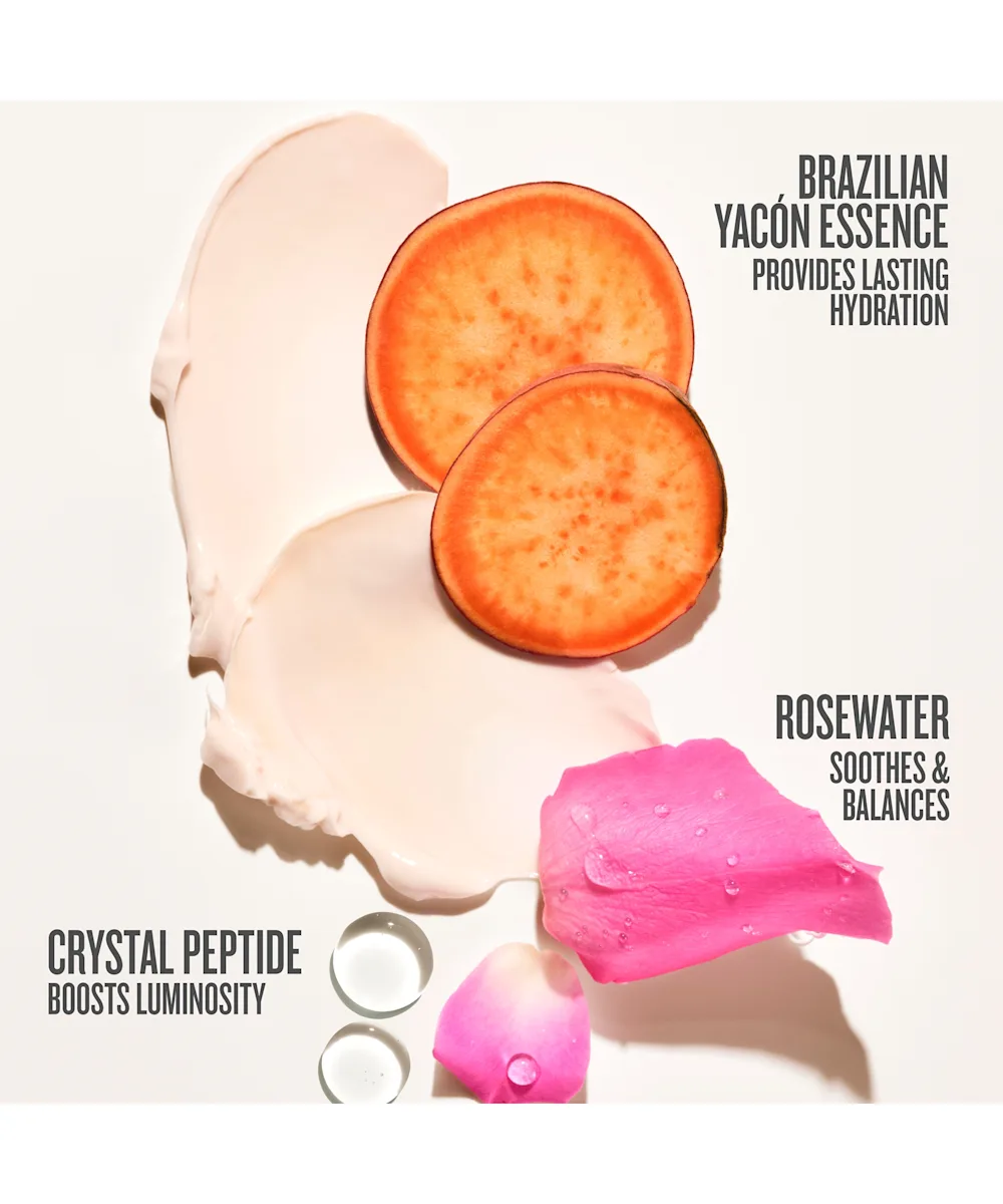 Aqua (Water, Eau), Glycerin, Dicaprylyl Carbonate, Diphenylsiloxy Phenyl Trimethicone, Propanediol, Parfum (Fragrance), Propylene Glycol Dibenzoate, C14-22 Alcohols, Cetearyl Alcohol, Dimethicone, Betaine, Palmitoyl Tetrapeptide-10, Polymnia Sonchifolia (Brazilian Yacón) Root Juice, Rosa Damascena Flower Water, Butyrospermum Parkii (Shea) Butter, Astrocaryum Murumuru Seed Butter, Theobroma Grandiflorum (Cupuaçu) Seed Butter, Mangifera Indica (Mango) Seed Butter, Myrciaria Dubia (Camu Camu) Fruit Extract, BisDiglyceryl Polyacyladipate-2, Cetearyl Olivate, Caprylyl Glycol, Caprylic/Capric Triglyceride, Cetyl Palmitate, Butylene Glycol, Hydrogenated Lecithin, Sorbitan Stearate, C12-20 Alkyl Glucoside, Sorbitan Olivate, Polysorbate 80, 1,2-Hexanediol, Hydroxyethyl Acrylate/Sodium Acryloyldimethyl Taurate Copolymer, Acrylates/C10-30 Alkyl Acrylate Crosspolymer, Xanthan Gum, Sodium Phytate, Citric Acid, Tromethamine, Sodium Benzoate, Potassium Sorbate, Hydroxyacetophenone, Tocopherol, Citronellol, Limonene, Linalool, Linalyl Acetate, Pinene, Rose Ketones, Tetramethyl Acetyloctahydronaphthalenes, Trimethylcyclopentenyl Methylisopentenol, Caramel, CI 17200 (Red 33), CI 15985 (Yellow 6).