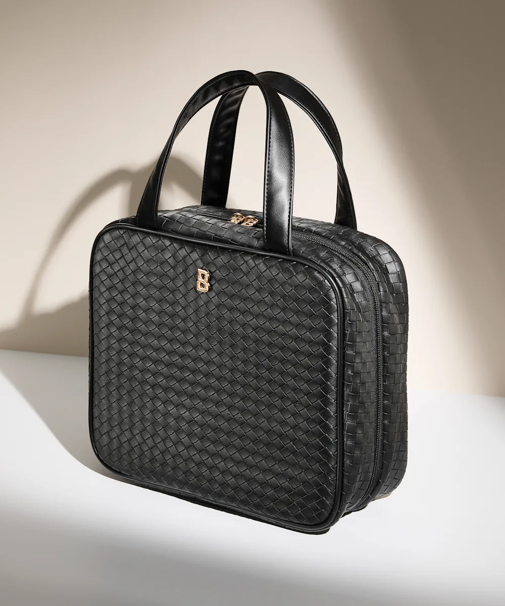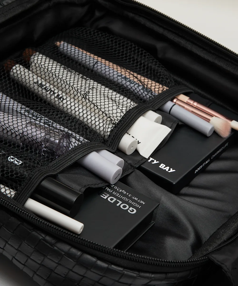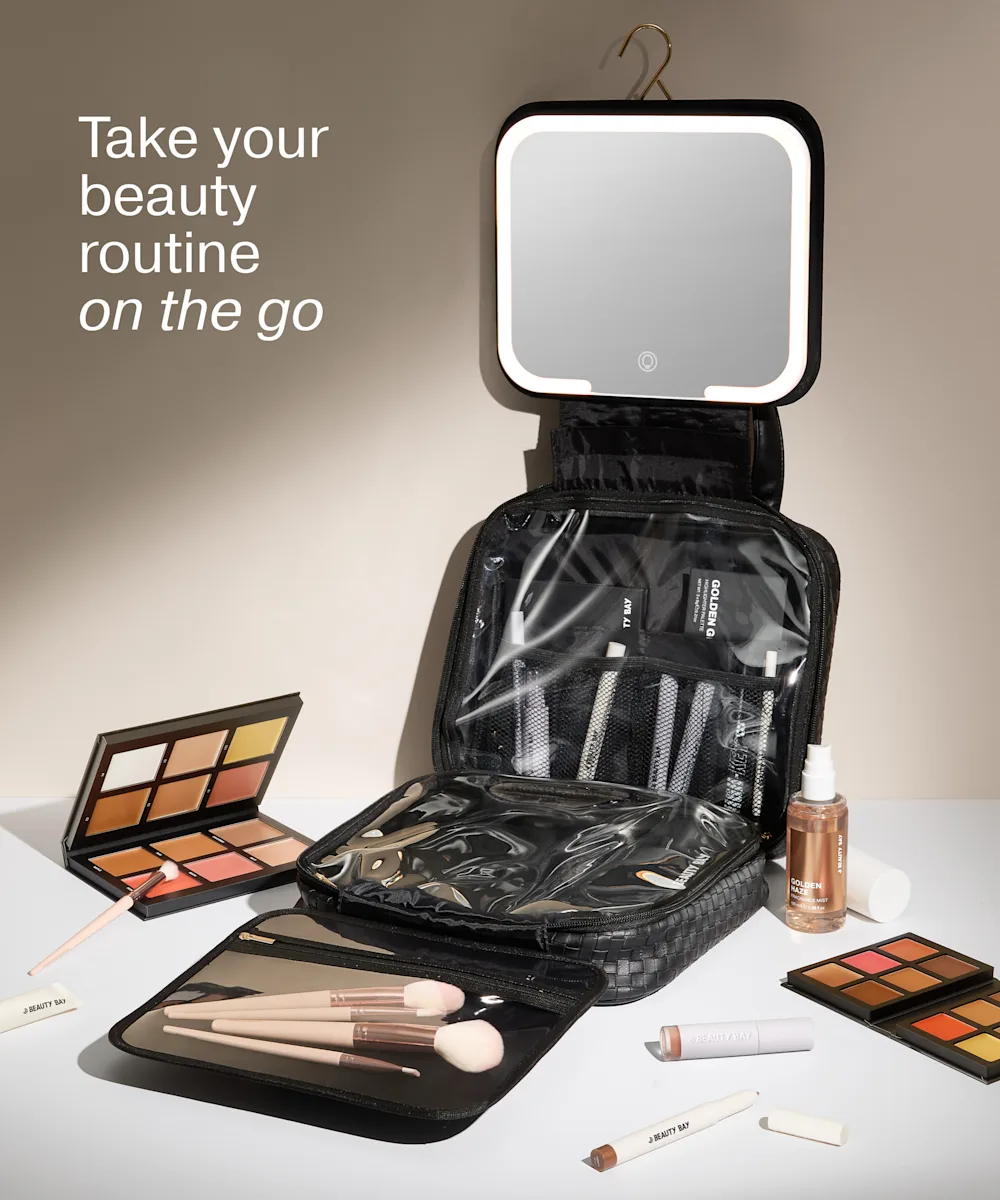 Stay organised wherever you are with the LED Mirror Beauty Organiser from By BEAUTY BAY. Featuring three compartments, a hook for hanging, and handles, this fold-out bag makes it effortless to take your beauty routine on the go. Inside, a detachable, rechargeable LED mirror ensures perfect lighting at any time. It features clear compartment covers, elastic holders for products and brushes, and mesh and wipe-proof pockets to keep everything visible, secure, and easy to access. Crafted from black woven PU with gold hardware, this ultra-convenient travel case combines functionality with a sleek, luxurious finish. Finished with custom ‘B’-shaped zip pulls and a gold embossed ‘B’ logo, your on-the-go beauty case just got a serious upgrade.