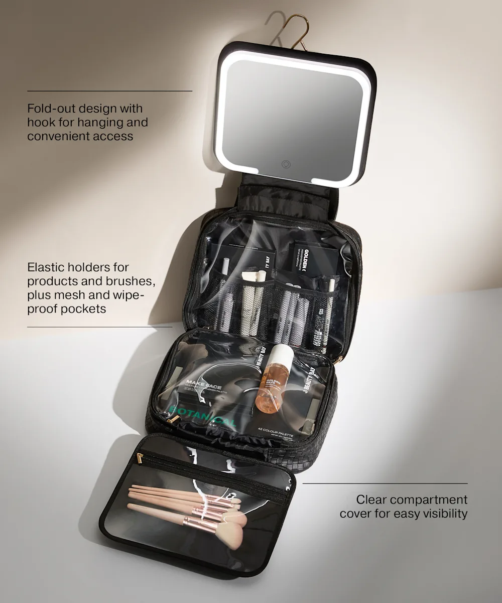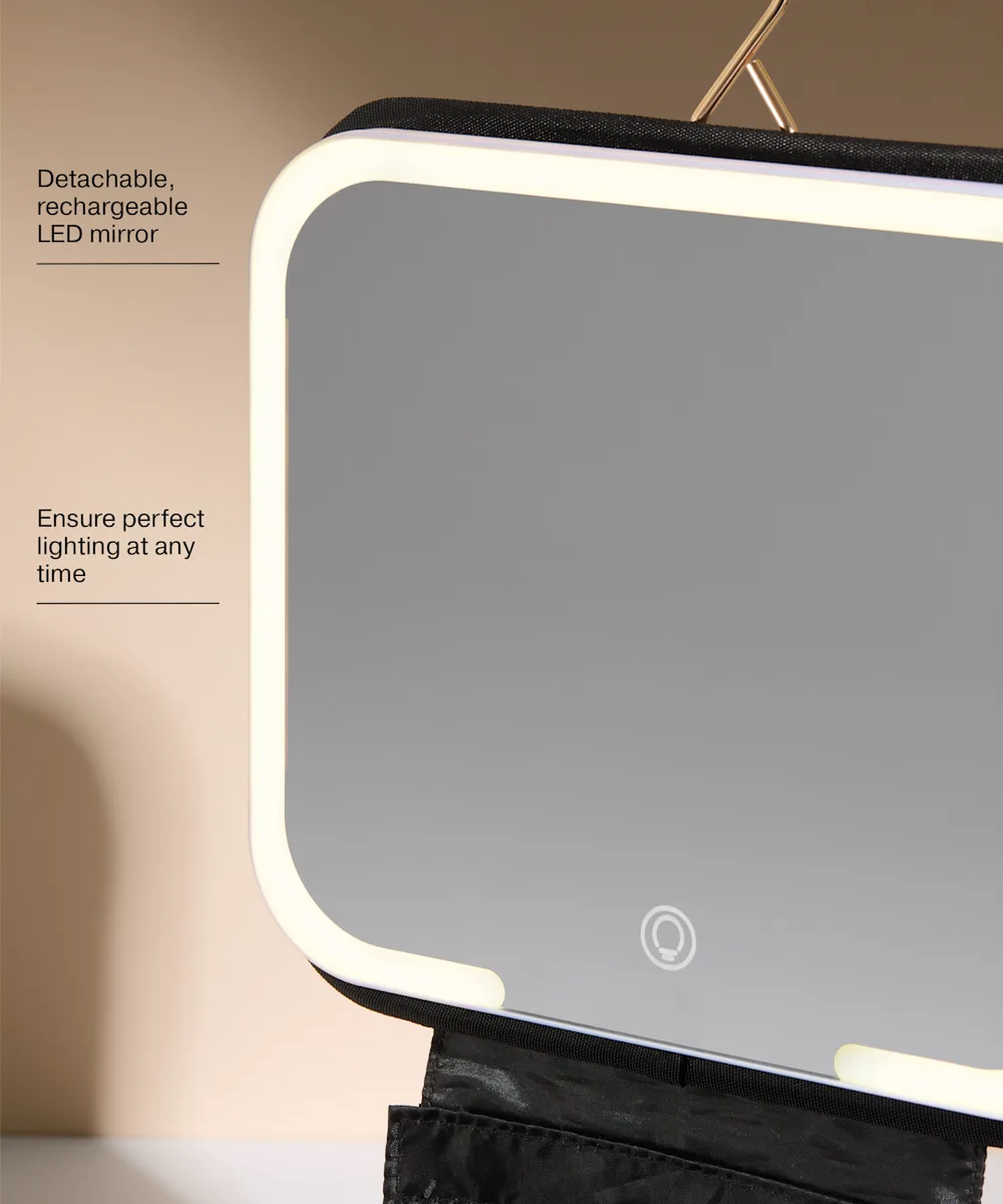A fold-out beauty case with a detachable LED mirror, ideal for storing beauty, bath, and skincare essentials.