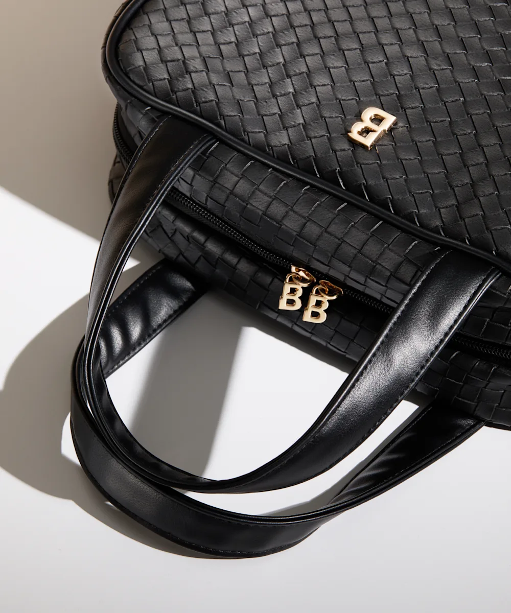 - Black woven PU with gold hardware, custom ‘B’-shaped zip pulls, and embossed gold ‘B’ logo