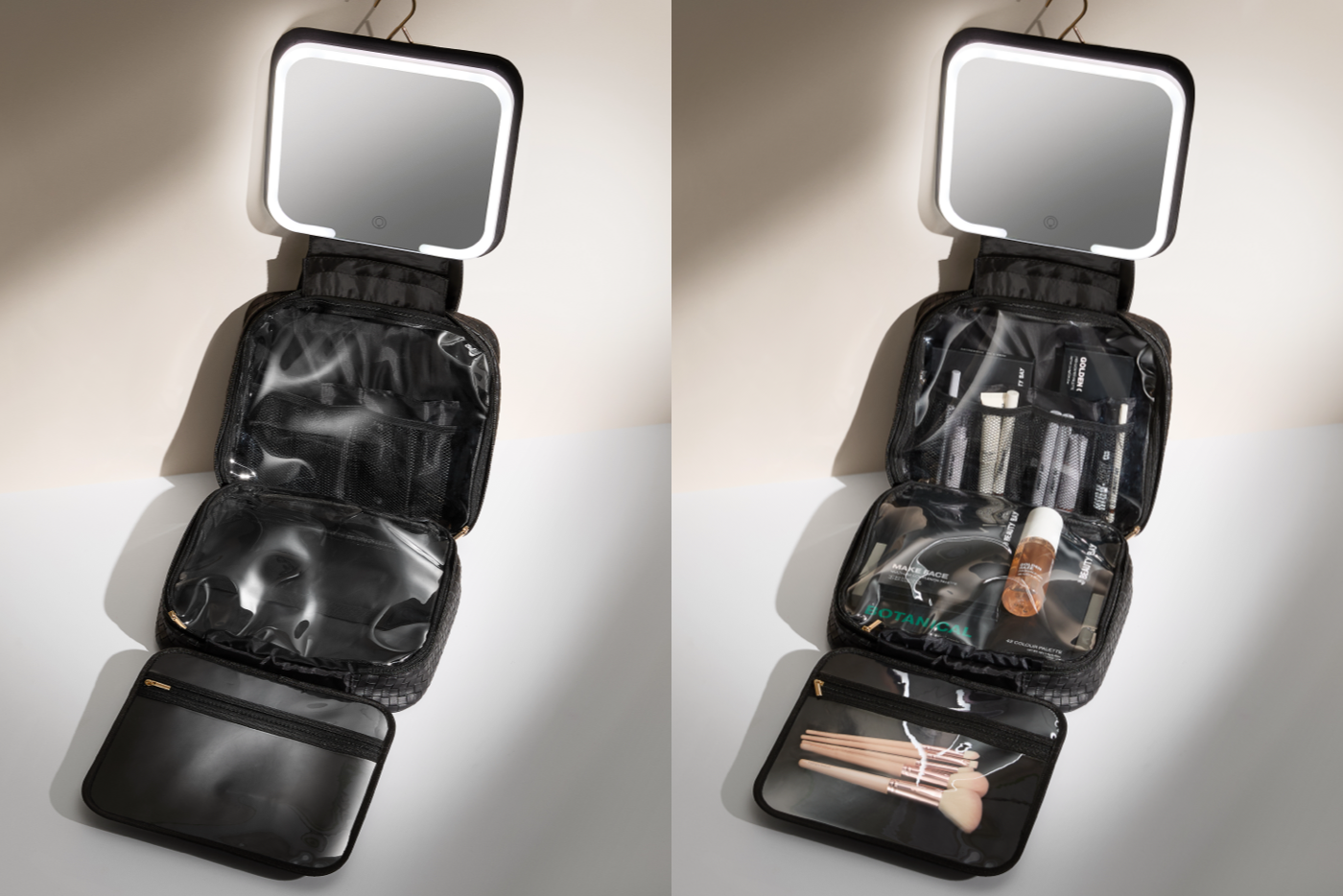 A fold-out beauty case with a detachable LED mirror, ideal for storing beauty, bath, and skincare essentials.
