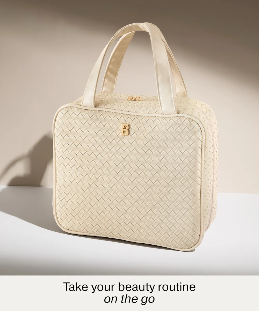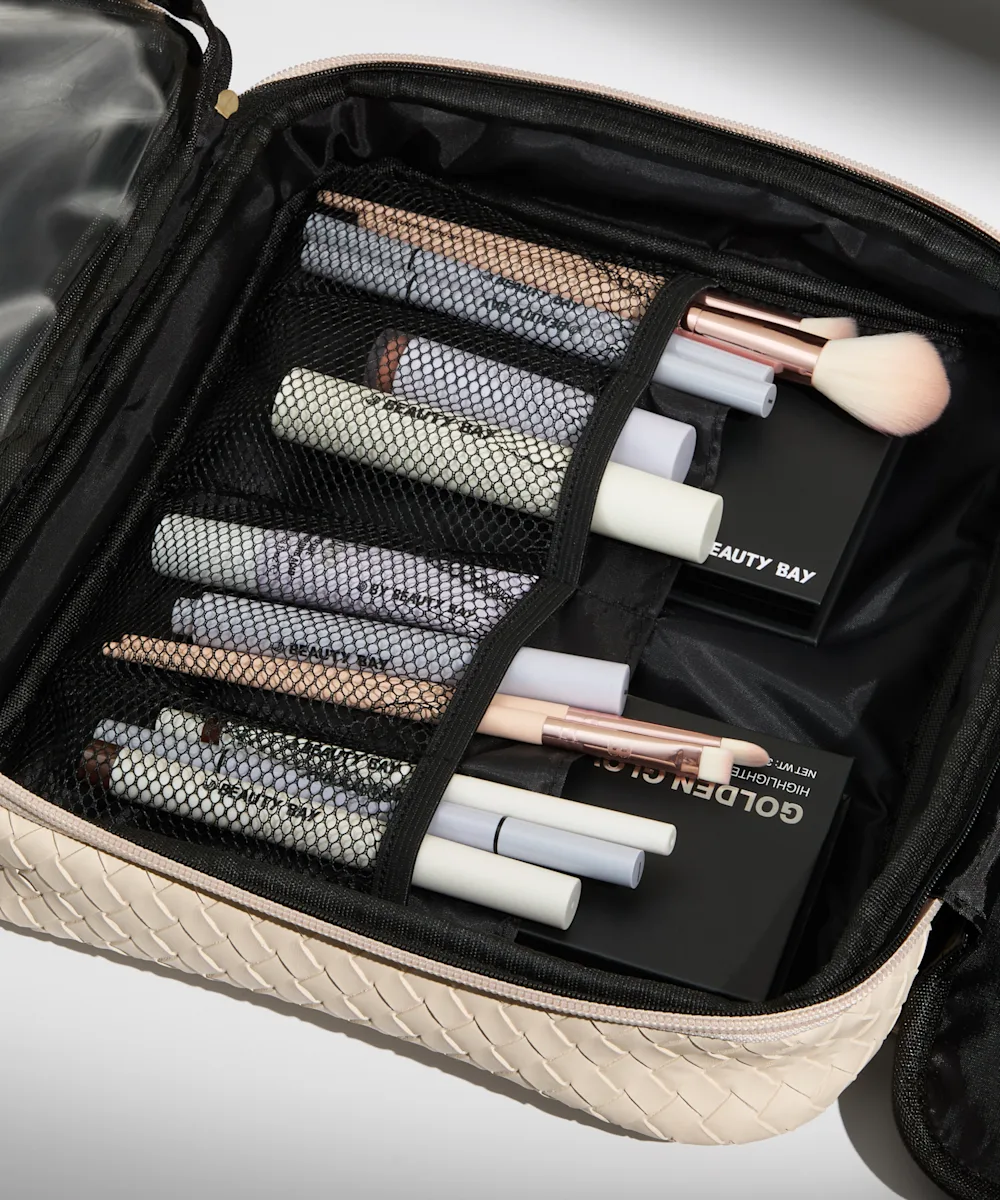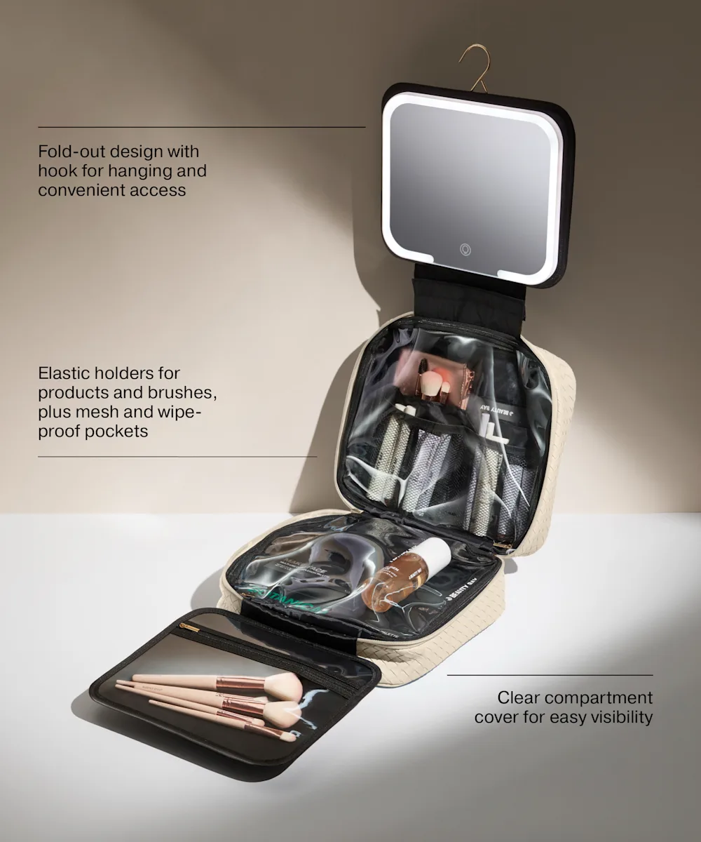 Stay organised wherever you are with the LED Mirror Beauty Organiser from By BEAUTY BAY. Featuring three compartments, a hook for hanging, and handles, this fold-out bag makes it effortless to take your beauty routine on the go. Inside, a detachable, rechargeable LED mirror ensures perfect lighting at any time. It features clear compartment covers, elastic holders for products and brushes, and mesh and wipe-proof pockets to keep everything visible, secure, and easy to access. Crafted from cream woven PU with gold hardware, this ultra-convenient travel case combines functionality with a sleek, luxurious finish. Finished with custom ‘B’-shaped zip pulls and a gold embossed ‘B’ logo, your on-the-go beauty case just got a serious upgrade.