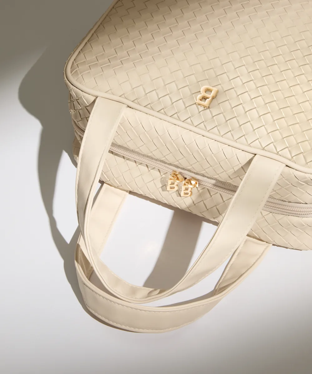 - Cream woven PU with gold hardware, custom ‘B’-shaped zip pulls, and embossed gold ‘B’ logo