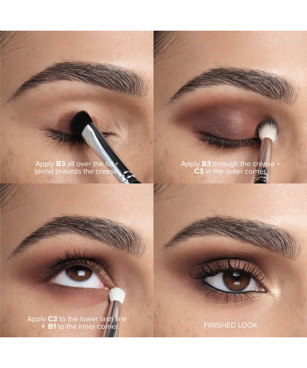 - Use firm, dense brushes to deposit product and fluffy brushes to diffuse and blend.