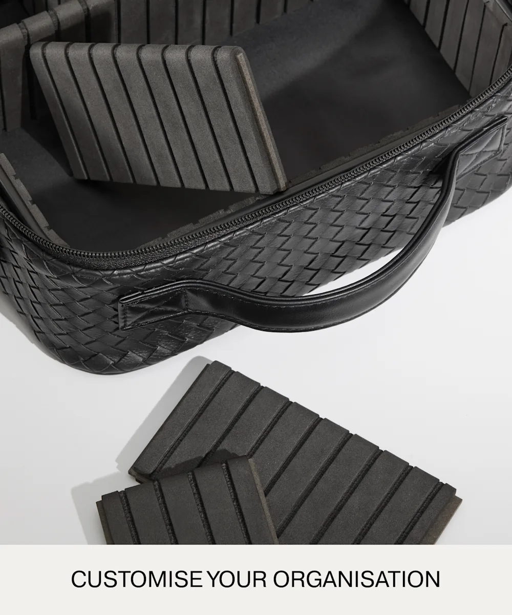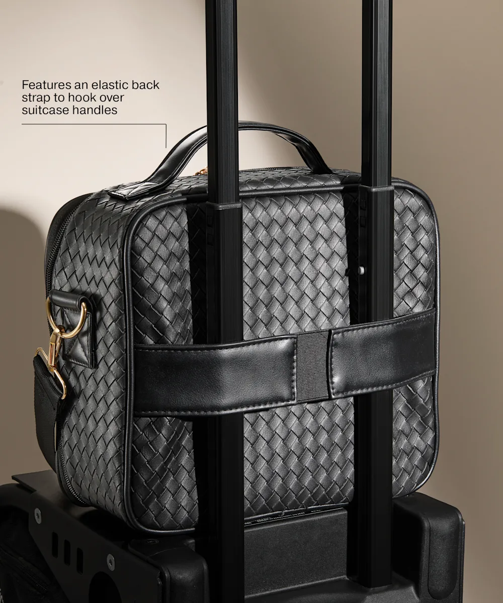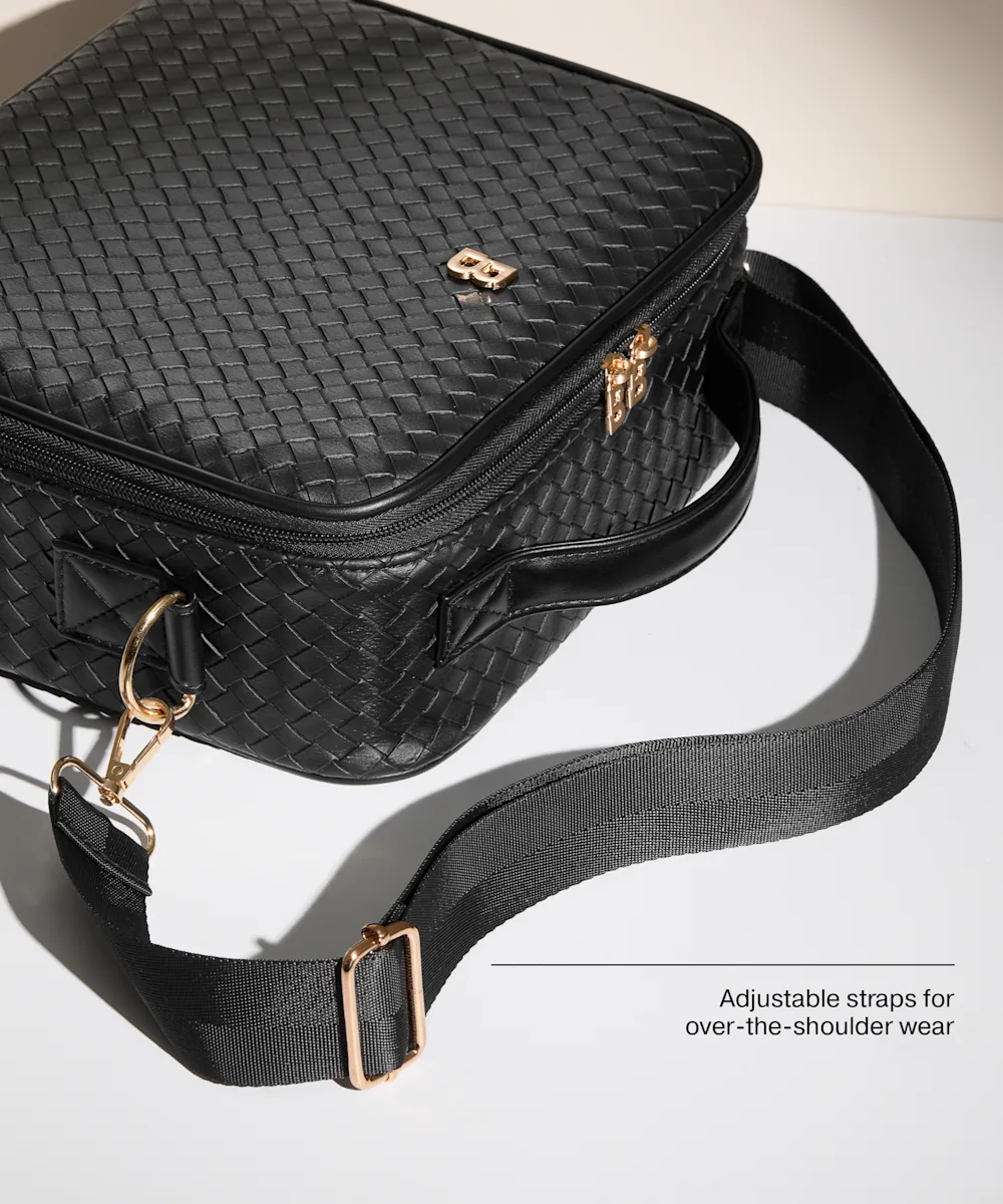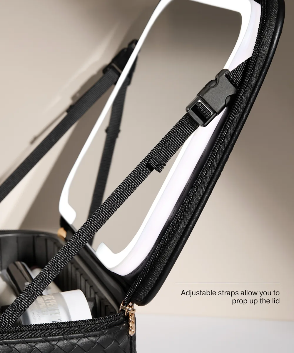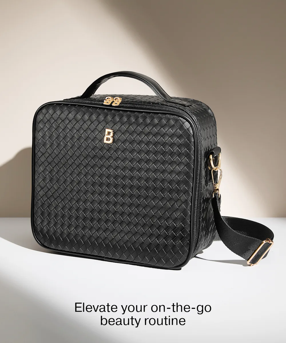 Elevate your on-the-go beauty routine with the LED Mirror Travel Beauty Case from By BEAUTY BAY. This structured, stylish case features an elastic back strap to hook over suitcase handles and adjustable straps for over-the-shoulder wear. Inside, the removable sturdy separators let you customise your organisation to fit around your beauty products. And the adjustable straps allow you to prop up the lid which features a detachable, rechargeable LED mirror. Made from black woven PU with gold hardware, this beauty bag is finished with custom ‘B’-shaped zip pulls and a gold embossed ‘B’ logo for a sleek, signature look. Your next trip just got an upgrade.