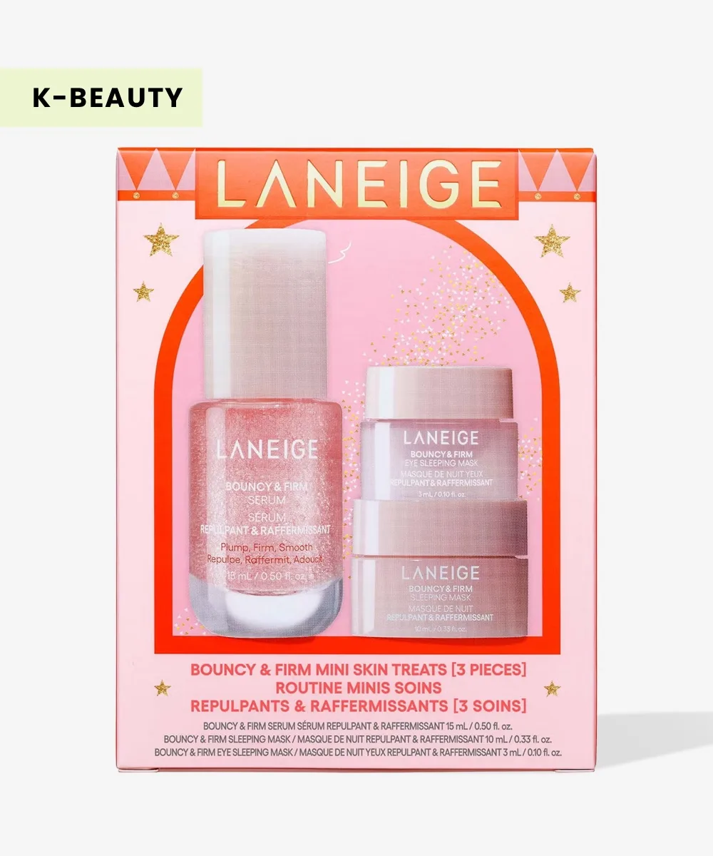 Give the gift of bouncy-looking skin with the Laneige Bouncy & Firm Mini Skin Treats. This travel-sized slow-aging routine is perfect for gifting or to keep for yourself. It features three Laneige Bouncy & Firm minis, including a visibly firming serum, a sleeping mask for bouncy-looking skin, and a cooling & depuffing eye sleeping mask.