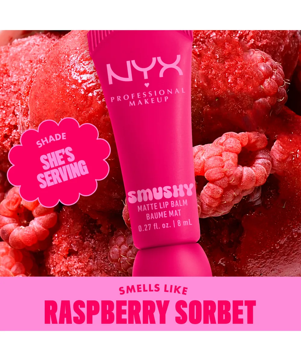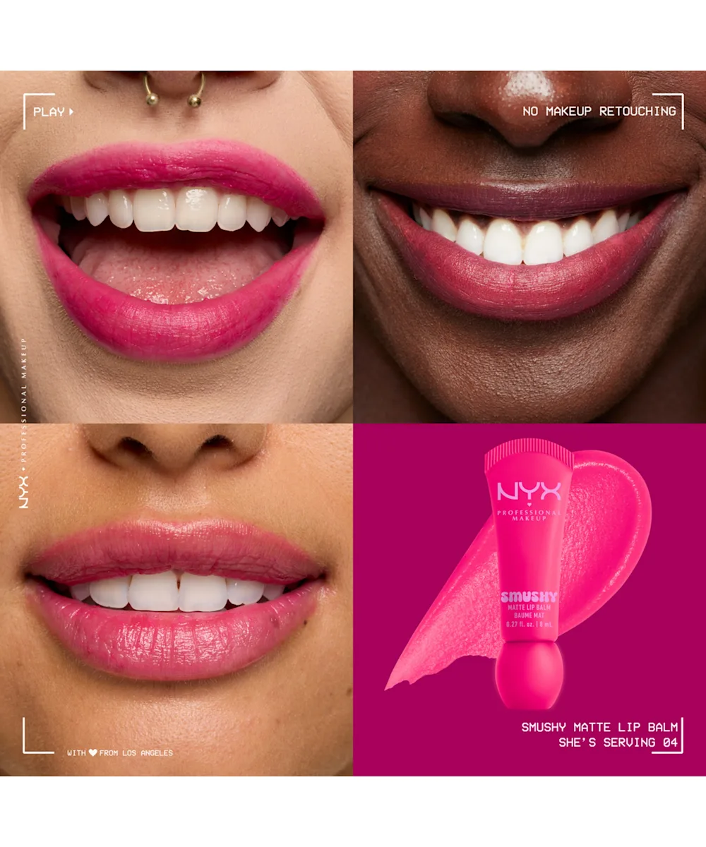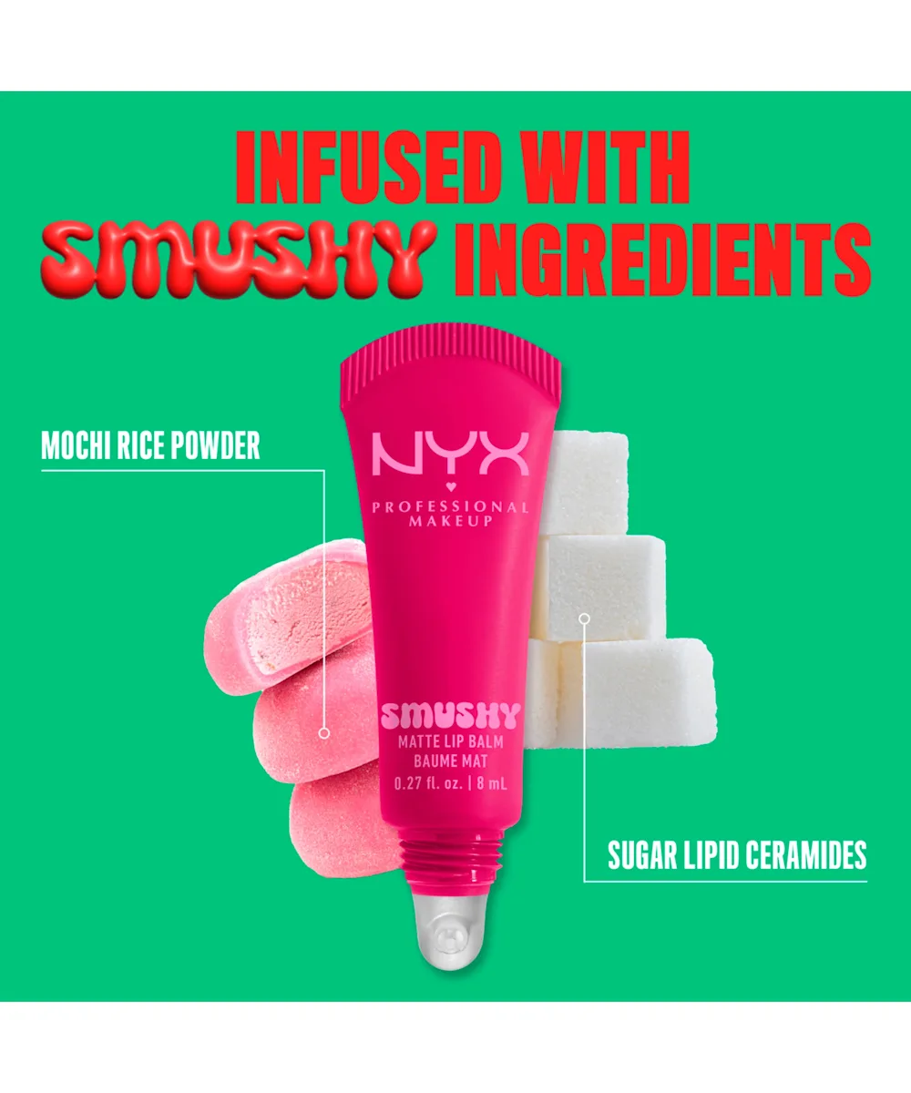 Swipe on your softest lips yet with the NYX Professional Makeup Smushy Matte Lip Balm. Formulated with mochi rice powder to cushion and sugar ceramides to smooth, this lightweight balm delivers a cloud-like wash of buildable colour with a sweet, diffused matte look. The smushy-soft texture glides on effortlessly with a silicone applicator, wrapping lips in blurred, sheer finish for all-day comfort. With 12 versatile shades, each with its own sweet scent, this playful lip balm is made for every mood and every occasion.
