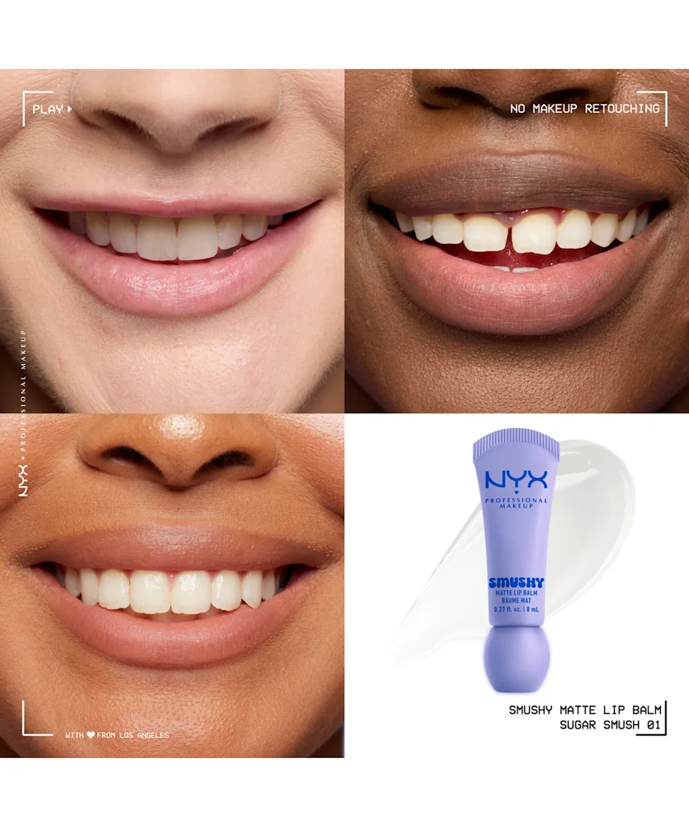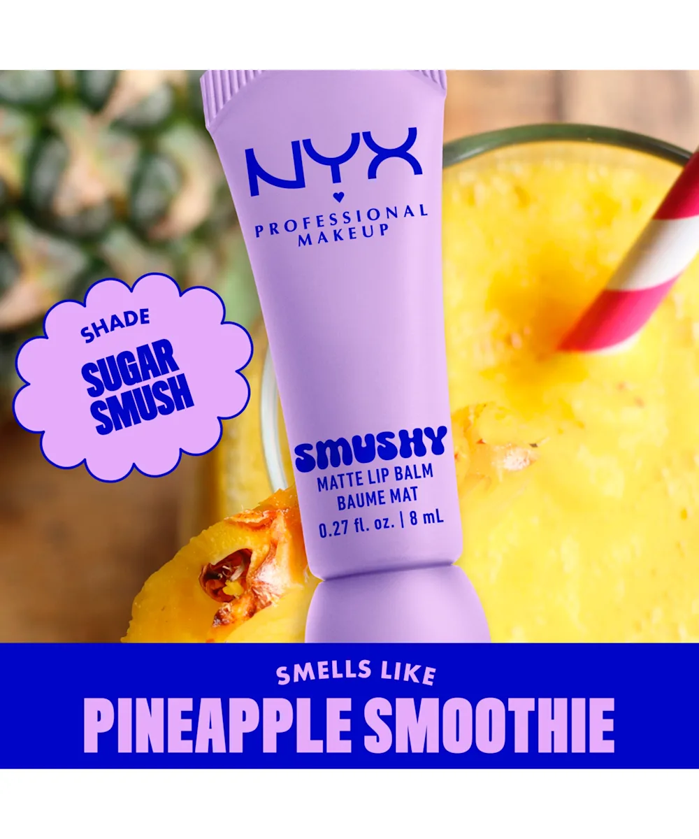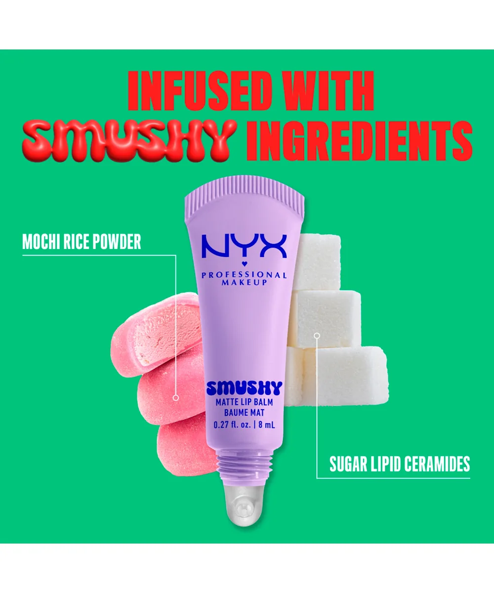 Swipe on your softest lips yet with the NYX Professional Makeup Smushy Matte Lip Balm. Formulated with mochi rice powder to cushion and sugar ceramides to smooth, this lightweight balm delivers a cloud-like wash of buildable colour with a sweet, diffused matte look. The smushy-soft texture glides on effortlessly with a silicone applicator, wrapping lips in blurred, sheer finish for all-day comfort. With 12 versatile shades, each with its own sweet scent, this playful lip balm is made for every mood and every occasion.