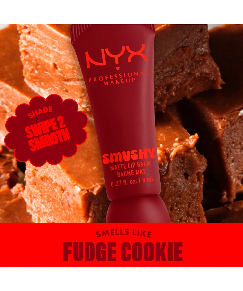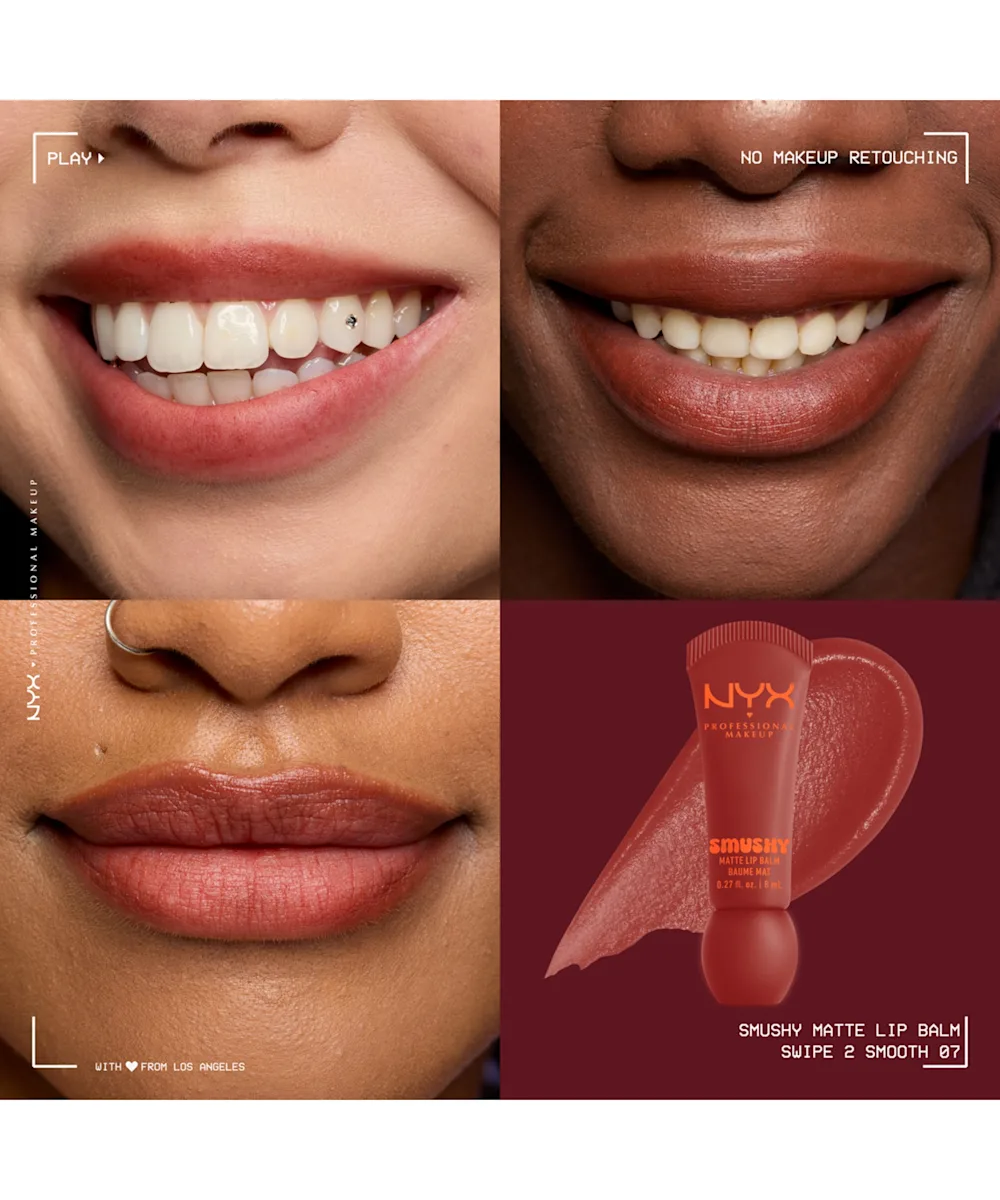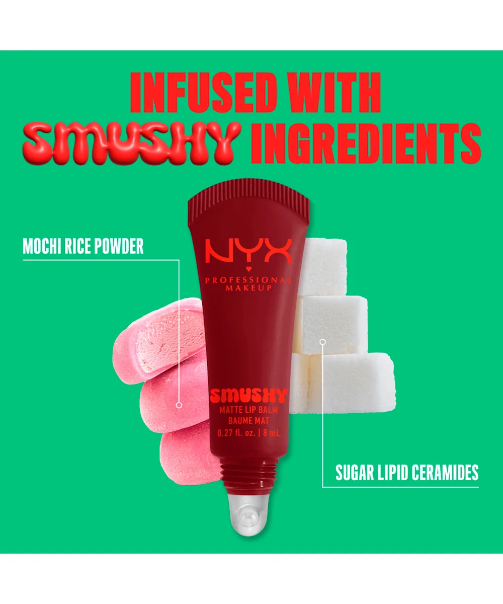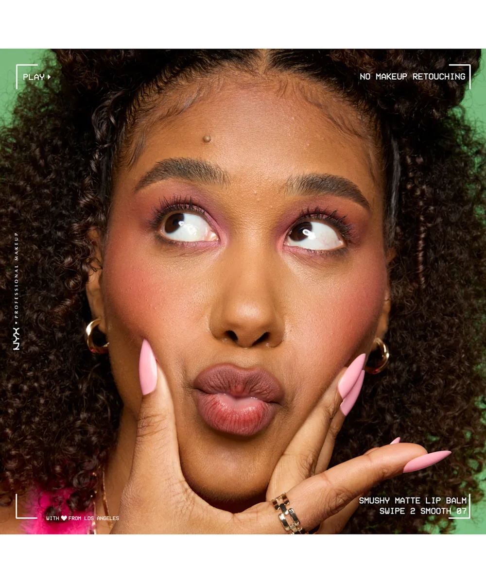 Swipe on your softest lips yet with the NYX Professional Makeup Smushy Matte Lip Balm. Formulated with mochi rice powder to cushion and sugar ceramides to smooth, this lightweight balm delivers a cloud-like wash of buildable colour with a sweet, diffused matte look. The smushy-soft texture glides on effortlessly with a silicone applicator, wrapping lips in blurred, sheer finish for all-day comfort. With 12 versatile shades, each with its own sweet scent, this playful lip balm is made for every mood and every occasion.