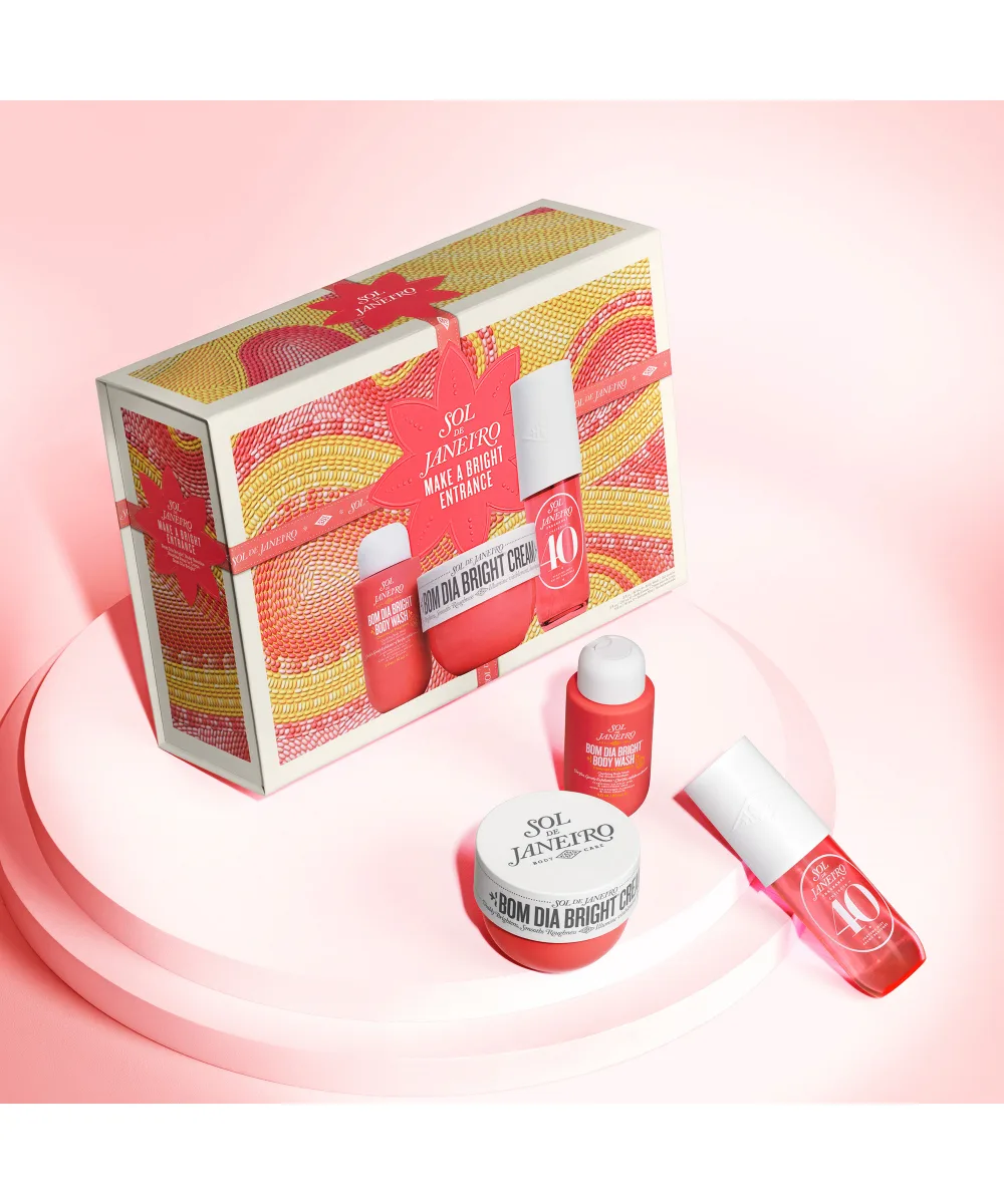 Start every day on a radiant note with the Sol de Janeiro Make a Bright Entrance Kit. This uplifting trio is infused with the bright and vibrant Bom Dia fragrance, designed to awaken your senses and leave skin glowing. Cleanse with a refreshing body wash, hydrate with a luminous cream, and finish with the sultry Cheirosa ’40 Perfume Mist for a long-lasting, confident scent. The perfect routine to glow from morning to night.
